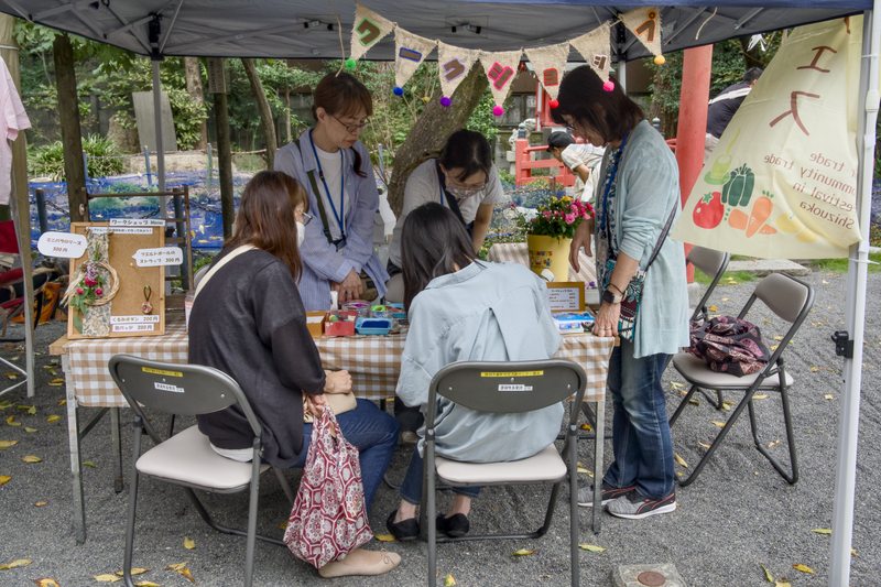 フェアコミフェス実行委員メンバーとボランティアさんで運営する『フェアトレードの素材を使ったワークショップ』のブースです。